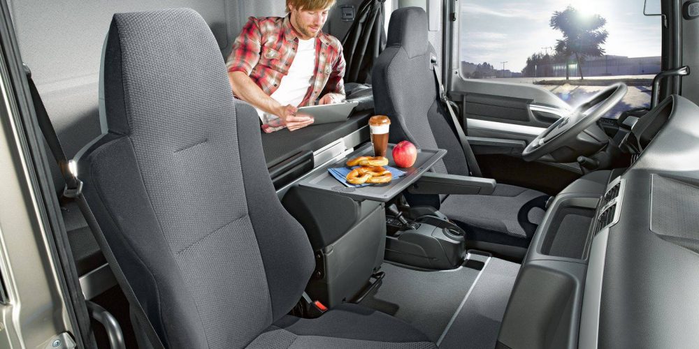 Vilkike gausu daiktadėžių, taip pat yra šaldytuvas, kuriame telpa iki 40 litrų maisto. Keleivio sėdynę galima pasukti, todėl kabinoje lengviau judėti – atsiranda kur kas daugiau vietos, o ir naujausių vilkikų kabinų grindys – lygios. Kabinoje gausu elektros lizdų, tad galima įkrauti nešiojamąjį kompiuterį ar mobilųjį telefoną. Pulteliu galima reguliuoti apšvietimo intensyvumą bei nustatyti, kad, pavyzdžiui, radijas išsijungtų po tam tikro laiko, vairuotojui užmigus.