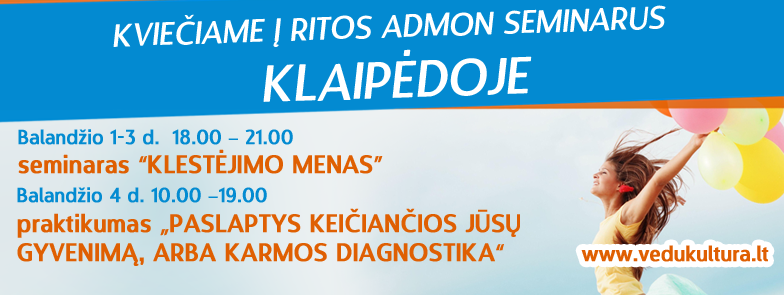 Balndžio 4d (šeštadienį) vyks Ritos Admon praktikumas: „PASLAPTYS KEIČIANČIOS JŪSŲ GYVENIMĄ, ARBA KARMOS DIAGNOSTIKA” daugiau informacijos: http://vedukultura.lt/renginys/paslaptys-keiciancios-jusu-gyvenima-arba-karma-diagnostika-2
