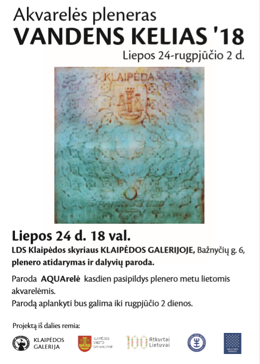 Šių metų liepos 24 – rugpjūčio 2 dienomis LDS Klaipėdos skyrius įgyvendins projektą KLAIPĖDOS AKVARELISTAI – VANDENS KELIAS 2018, kurį iš dalies finansuoja Lietuvos dailininkų sąjunga ir Klaipėdos miesto savivaldybė. LDS Klaipėdos skyrius norėdamas išsaugoti ir pratęsti žymios Klaipėdos menininkės Renatės Lūšies iniciatyva gimusią plenero idėją, siekia toliau plėtoti akvarelės meistriškumo platformą Klaipėdoje. Šių metų tema – Vandens kelias – dedikuojama Lietuvos valstybės atkūrimo šimtmečio minėjimui. Vandens kelio simbolika labai plati, prasminga ir gili. Begalinis menininkų noras kurti, kuris kaip vanduo – prasisunkia, randa kelią visur, nepaisant kliūčių ir sunkumų, suburia spalvos šventei, kuri išsiskleidžia vandenyje. Tai – akvarelės esmė. Kūrinių metamorfozės vyksta vandeniui liejantis.