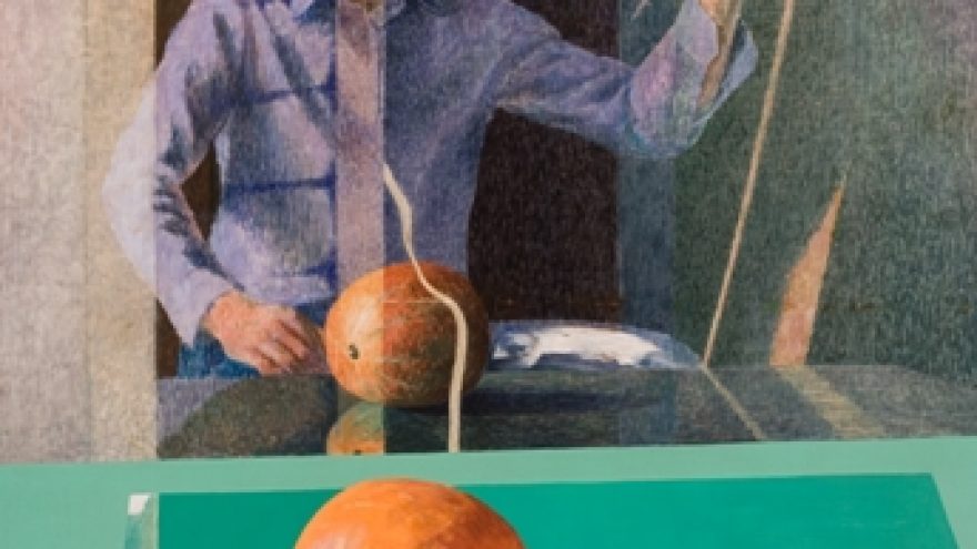 Iliustracija – Algimantas Švėgžda. Autoportretas su moliūgu. 1977. Kart., temp., 115×87 cm. Lietuvos dailės muziejus