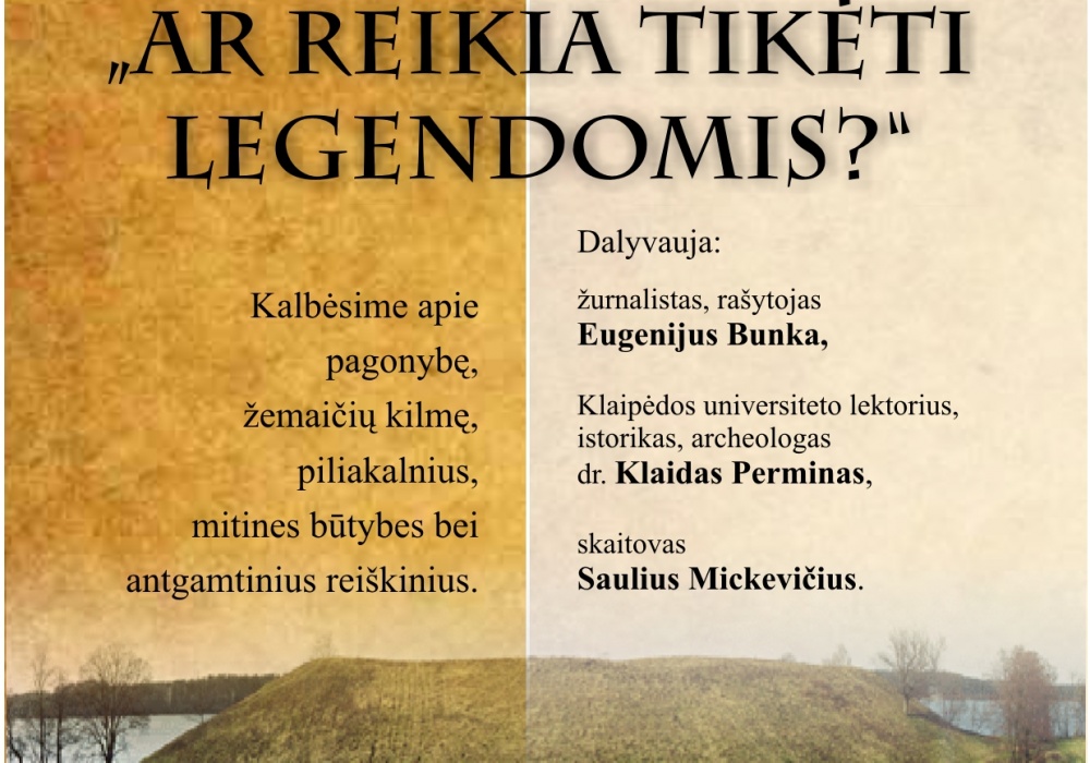 Kovo 26 d. 17.30 val. Klaipėdos miesto savivaldybės viešosios bibliotekos Pempininkų filiale (Taikos pr. 79/81A) kviečiame į diskusiją „Ar reikia tikėti legendomis?”. Dalyvauja žurnalistas, knygos „Kita legendų kalba” autorius Eugenijus Bunka, Klaipėdos universiteto lektorius, istorikas, archeologas dr. Klaidas Perminas, skaitovas Saulius Mickevičius.