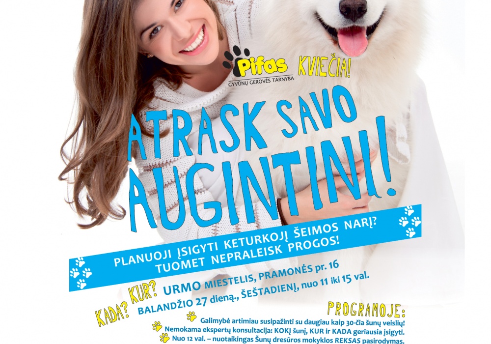 Ketini įsigyti keturkojį šeimos narį? Tuomet nepraleisk progos ir atvyk kartu su šeima bei draugais į Gyvūnų gerovės tarnybos PIFAS organizuojamą renginį „Atrask savo augintinį!“.