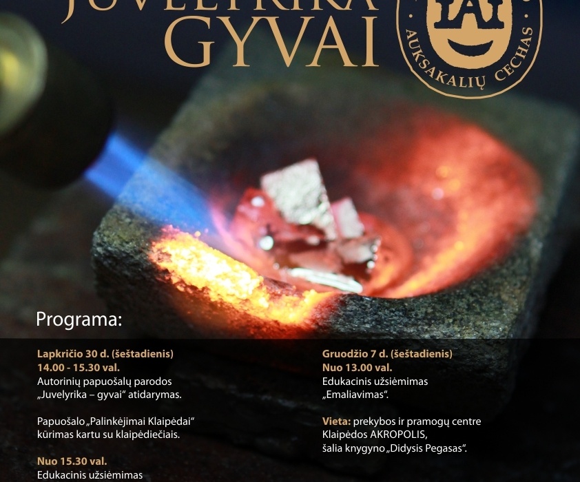 Š. m. lapkričio 30 – gruodžio 15 dienomis Klaipėdos krašto auksakalių cechas kviečia klaipėdiečius ir miesto svečius į tikrą auksakalystės šventę – į dviejų savaičių trukmės renginių ciklą „Juvelyrika – gyvai”. Šventės metu startuos ir vyks cecho tradicinė kalėdinė juvelyrikos paroda, bus pristatyta fotogarfijų paroda, du šeštadienius iš eilės vyks edukaciniai auksakalystės užsiėmimai. Bet įdomiausia renginio dalis – tai bendra auksakalių ir klaipėdiečių kūryba, gaminant papuošalą „Palinkėjimai Klaipėdai”. Papuošalas bus pristatytas parodos uždarymo metu. Renginys vyks prekybos ir pramogų centre Klaipėdos AKROPOLIS.