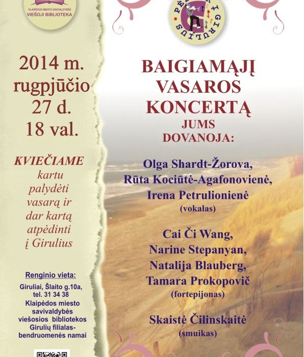 Rugpjūčio 27 d. (paskutinį vasaros trečiadienį) palydime vasarą ir užbaigiame 5-ąją kultūrinių renginių programą „Pėdink į Girulius”. Ta proga visus programos dalyvius ir lankytojus kviečiame dar kartą susitikti Klaipėdos miesto savivaldybės viešosios bibliotekos Girulių filiale-bendruomenės namuose (Šlaito g. 10 a) ir pasiklausyti paskutinio šios vasaros koncerto, kurį mums dovanoja Klaipėdos Stasio Šimkaus konservatorijos dėstytojai ir jų draugai.