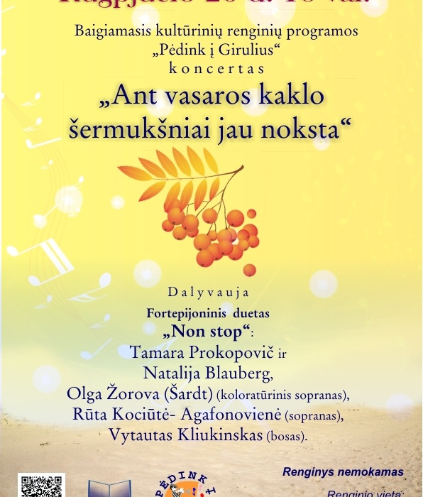 Rugpjūčio 26 d. 18 val. kultūrinių renginių programos „Pėdink į Girulius“ baigiamasis koncertas „Ant vasaros kaklo šermukšniai jau noksta“. Skambės klasikinė ir pramoginė bei populiarioji XX a. muzika. Baigiamąjį vasaros koncertą dovanoja fortepijoninis duetas „Non stop“: Tamara Prokopovič ir Natalija Blauberg, Olga Žorova – Šardt (koloratūrinis sopranas), Rūta Kociūtė-Agafonovienė (sopranas), Vytautas Kliukinskas (bosas).