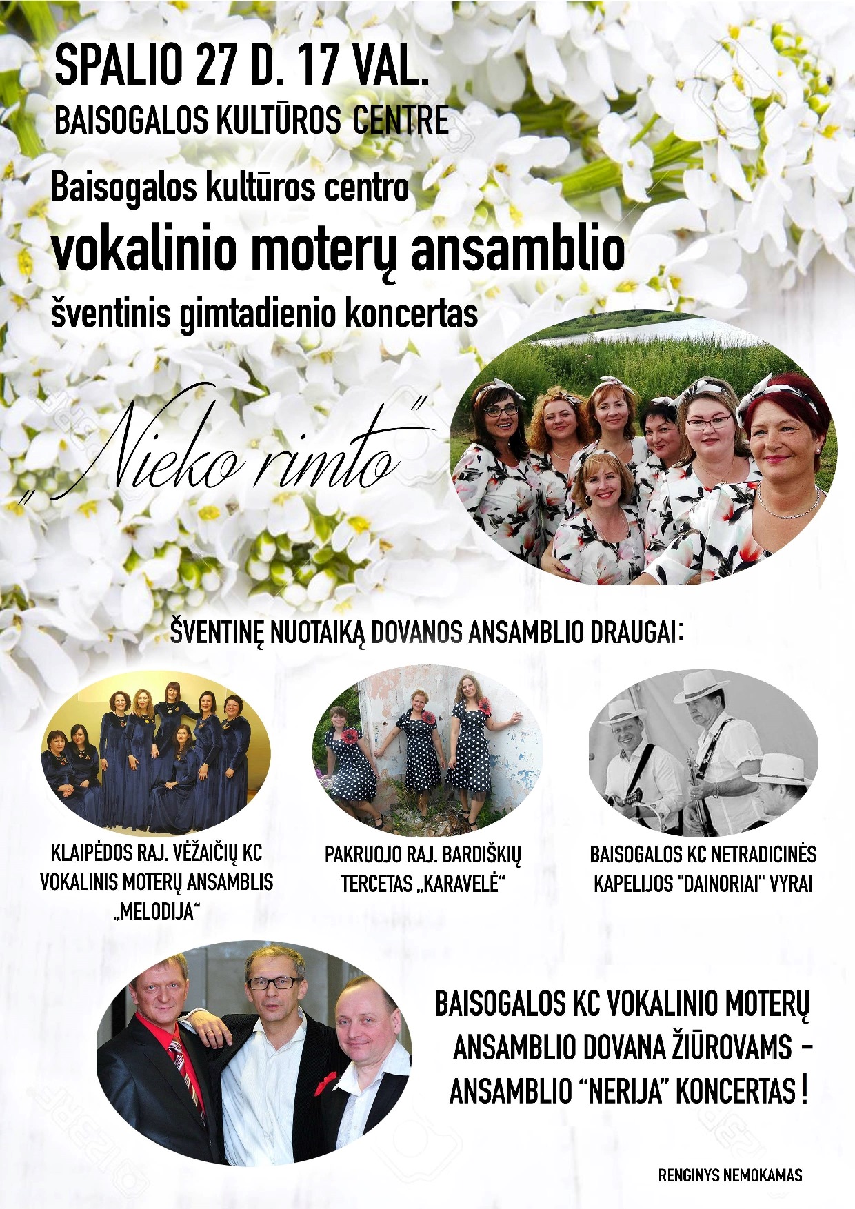 Linksmas, nuotaikingas ir nuoširdus Baisogalos KC vokalinio moterų ansamblio koncertas “Nieko rimto”, skirtas kolektyvo kūrybinės veiklos 10-mečiui paminėti. Kiek pavėluotas dėl kultūros centro renovacijos, tačiau gimtadienius juk reikia švęsti!