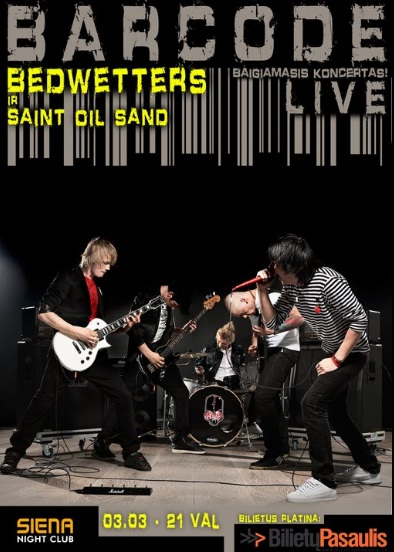 Ar tu pasiruošęs triukšmingam „Barcode“ finalui? Mes sakome: TAIP! Ir pristatome BEDWETTERS – pirmuosius estus, laimėjusius MTV apdovanojimą ir laikomus viena įdomiausia electro/punk-rock grupe. Kaune gerą „apšilimą“ garantuoja energingieji „Saint Oil Sand“, Vilniuje – viena kokybiškiausių gyvos muzikos grupių Lietuvoje „Sweetsalt“. BEDWETTERS Penki žavūs, nuostabūs, šaunūs, charizmatiški Myžniai iš Estijos. Taip taip, tai Bedwetters! Laimėję Coca Cola Soundwave‘07 konkursą gimtojoje Estijoje, jie gavo išskirtinę MTV progą – nufilmuoti pirmąjį vaizdo klipą dainai Dramatic Letter To Conscience. Tačiau sėkmė nuo jų ir toliau nenusisuko, nominuoti MTV EMA’07 apdovanojimuose New Sound Of Europe kategorijoje, jie nušluostė nosis tokiems atlikėjams kaip Sunrise Avenue ir Klaxons, parsiveždami apdovanojimą namo ir tapdami pirmąją estu grupe, laimėjusia MTV apdovanojimą. Tačiau vaikinai neužmigo ant laurų ir toliau sunkiai dirbo, susuko dar tris vaizdo klipus ir išleido debiutinį albumą „Meet The Fucking Bedwetters“. Garsieji estai griausmingai užbaigs kokybiškos alternatyvos projektą „Barcode“. Video: Bedwetters – Hayley http://www.youtube.com/watch?v=YPtLIhDnt3A Daugiau apie grupę: http://www.myspace.com/bedwettersband SAINT OIL SAND Grupė debiutavo 2006 metų festivalyje „Naujas Kraujas X“. Atlikėjai savo muziką apibūdina kaip ska ir roko mišinį, pagardintą panko dinamika bei džiazinėmis pučiamųjų partijomis. Tokiam, iš pirmo žvilgsnio beprasmiškam, grupės pavadinimui (liet. Šventas naftos smėlis) nemažai įtakos turėjo viena iš grupės dainų „Allah Akhbar“ ir tuo metu rūkytos kontrabandinės cigaretės Saint George :). Pasekmė – kažkokios abstrakčios Artimųjų Rytų dykumos (žemės, regiono, teritorijos ar dar bala žino ko) pavadinimas Saint Oil Sand. Grupė yra išleidusi du albumus: „Normaluz Žmoguz“ (2007) ir „Royal Sand“ (2009). Video: Saint Oil Sand – Bėgam Bėgam http://www.youtube.com/watch?v=sIalb4RBe0A Daugiau apie grupę: http://www.myspace.com/saintoilsand SWEETSALT Per penkerius gyvavimo metus jau gali pasigirti nemenkais pasiekimais: 2008 metais laimėjo prestižinį, MTV organizuojamą muzikos konkursą Coca-cola Soundwave, grojo viename didžiausių Lietuvoje festivalių – Be2gether bei kaimyninėje Lenkjoje vykstančiame „Coke Live Music Festival“ festivalyje kartu su pasaulio garso žvaidždėmis: grandais The Prodigy“, Kaiser Chiefs, Timbaland, Missy Elliott ir Sean Paul. Prieš porą mėnesių išleidę savo pirmąjį albumą: “Jie man sakė” Sweetsalt atkeliauja į LOFTĄ atsiveždami daug “saldžios druskos” prieskonio.