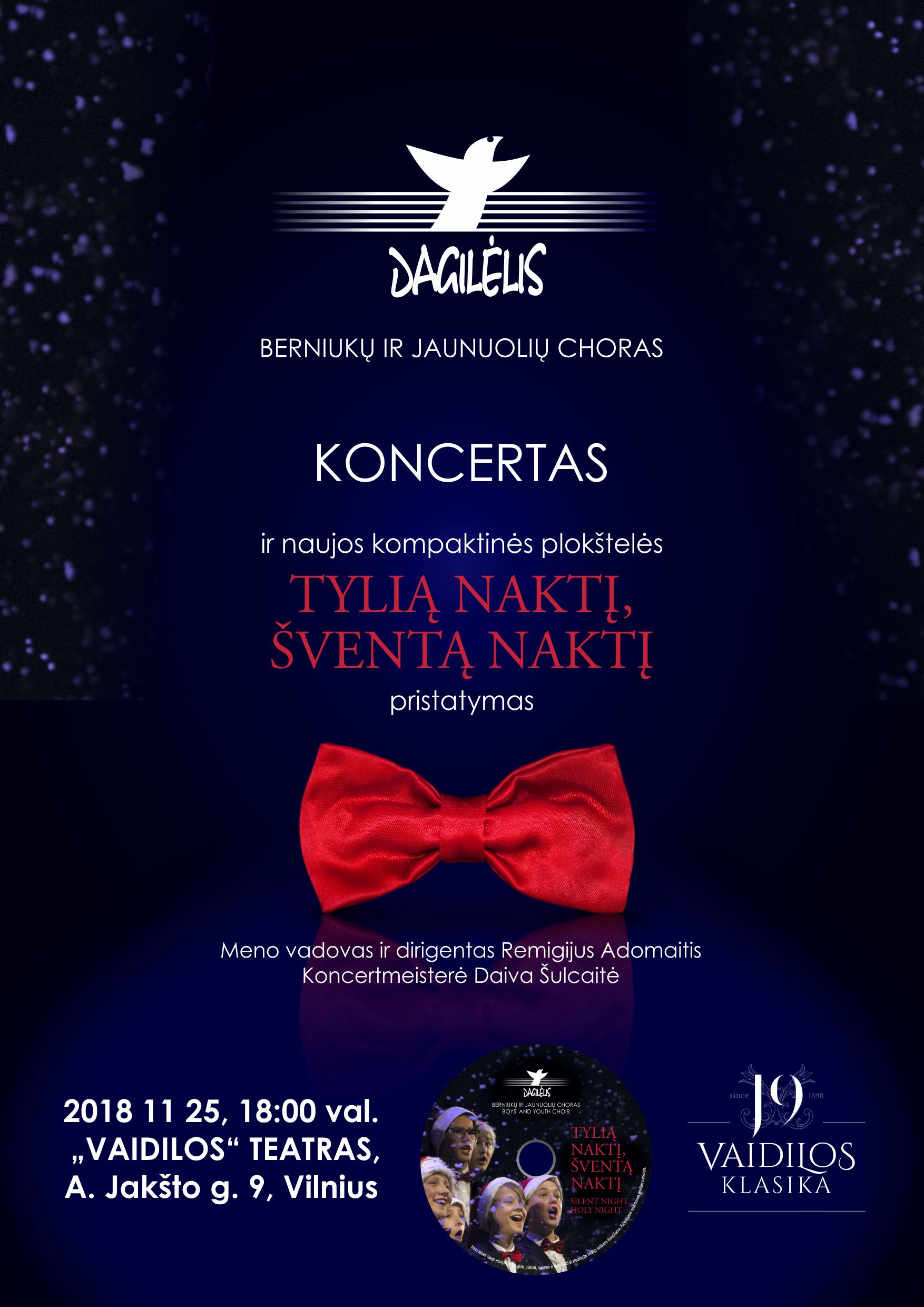 Koncertas kartu su naujausios choro kompaktinės plokštelės „Tylią naktį, šventą naktį“ pristatymu vyks sekmadienį (11.25) 18.00 val. Vilniaus „Vaidilos“ teatre (A. Jakšto g. 9, Vilnius).