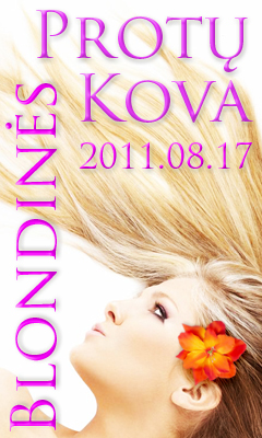 Mielosios damos, kviečiame Jus dalyvauti vasariškame bei moteriškame renginyje. Renkame šviesųjį Lietuvos protą ir siekiame išrinkti pačias išmintingiausias blondines. Norime įrodyti, kad mūsų šviesiaplaukės yra protingos bei gudrios. Protų kovoje “Blondinės” gali dalyvauti tik blondinės. Kviečiame registruotis vienas merginas, nebūtinai turinčias komandą. Galite registruotis nebūtinai po vieną, bet ir kartu su draugėmis. Visos užsiregistravusios merginos bus paskirstytos į komandas. Jeigu jau turite blondinių komandą, tai galite registruoti iš karto visą komandą (min. komandos narių skaičius 5, maksimalus – 8 nariai). Dalyvio mokestis: 5 Lt žmogui Kovoje gali dalyvauti tik asmenys, sulaukę 21 metų amžiaus (renginio metu būtina turėti tai patvirtinantį tapatybės dokumentą). Komandos registracija: https://spreadsheets.google.com/spreadsheet/embeddedform?formkey=dG5Jd09Sd3FTNU9zeWg3WGZSN1J5Tnc6MQ Dalyvės registracija: https://spreadsheets.google.com/spreadsheet/embeddedform?formkey=dFRLMlNWdHVZQVpOMzNWLXlnQWJ4S1E6MQ Renginys vyks: 2011 rugpjūčio 17 d. (trečiadienį) nuo 19:30 val. Registracija nuo 19:00. Renginio vieta: Sportinio pokerio klubas “Torro”, Antakalnio g. 37, Vilnius. Jūsų laukia gražus bei linksmas vakaras, pilnas pramogų ir staigmenų bei, aišku, smagi ir įnirtinga Protų kova. Daugiau informacijos: http://www.facebook.com/event.php?eid=139223549490071 Kontaktinis asmuo: Tel. nr. +370 652 02363 (Tomas), El. paštas [email protected]