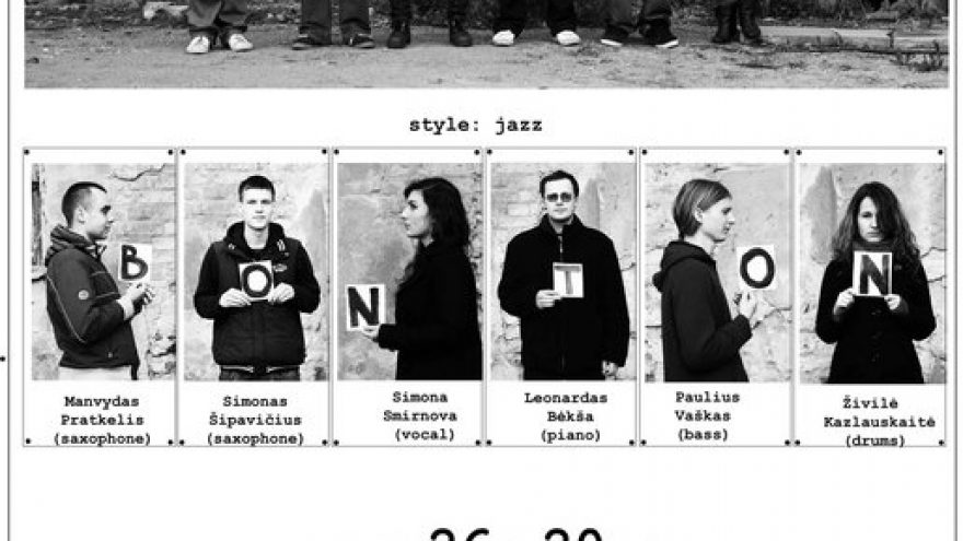 Ilgai besislapstę po paslaptingųjų Sluškų rūmų šešėliu ir dengę savo tikruosius veidus – į viešumą išeina naujai suburtas jaunų džiazo muzikantų projektas Bon Ton. Šis projektas, ne tik muzikinė naujovė bet ir stilistinis iššūkis. Koncerte galėsite išgirsti svingo, roko, bliuzo, funko ir rytietiško skambesio melodijų. Skambėsianti muzika – pagrįsta improvizacija, tad tai, ką išgirsite Artistų kiemelyje bus unikalu ir nenuspėjama, net patiems muzikantams. Koncerte skambės pačių muzikantų kūrybos kompozicijos bei aranžuoti džiazo standartai. Bon Ton muzikantai – LMTA studentai ir absolventai: Simona Smirnova – jazz vocal, Leonardas Bėkša – piano, Manvydas Pratkelis – saxophone, Živilė Kazlauskaitė – drums, Paulius Vaškas – bass.