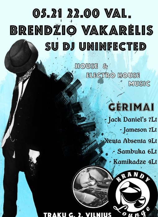 Vieta: Kavinė – baras Brandy Lounge, Trakų g. 2, Vilnius Laikas: Gegužės 21d. 22:00 – Gegužės 22d. 05:00 Įėjimas nemokamas Jeigu Jums nesisėdi namuose, kai už lango pavasaris, tai pati puikiausia proga pasimatyti su draugais jaukiame Brandy Lounge bare jau šį šeštadienį, kur Jūsų laukia žavingi ir energingi barmenai, geriausia ir įvairiausia muzika, lengva atmosfera, nevaržomas bendravimas. Ilgai laukti šilti pavasariški vakarai nepaliks nė vieno abejingo. Kad būtų dar šilčiau, pasinerkite į house ir electro house muzikos ritmus, kuriuos valdys Brandy Lounge baro rezidentas Dj Uninfected. Taip pat šiluma dvelks ir baro gėrimų asortimentas, kuriame rasite ne tik įvairiausių brendžio rūšių, bet taip pat ir skaniausiųjų kokteilių. – Brendis 4Lt; – Jack Daniel’s 7Lt; – Jameson 7Lt; – Xenta Absenta 9Lt; – Sambuka 6Lt; – Kamikadze 4Lt Brandy Lounge baras jau laukia Jūsų!
