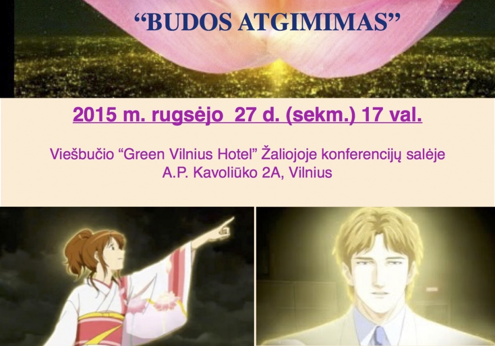 Rugsėjo 27 d. (sekm.) 17 val. kviečiame į japonų animacinio filmo “BUDOS ATGIMIMAS” peržiūrą ir aptarimą Vilniuje, Viešbučio “Green Vilnius Hotel” Žaliojoje konferencijų salėje (adresas: A.P. Kavoliūko g. 2A, Vilnius).