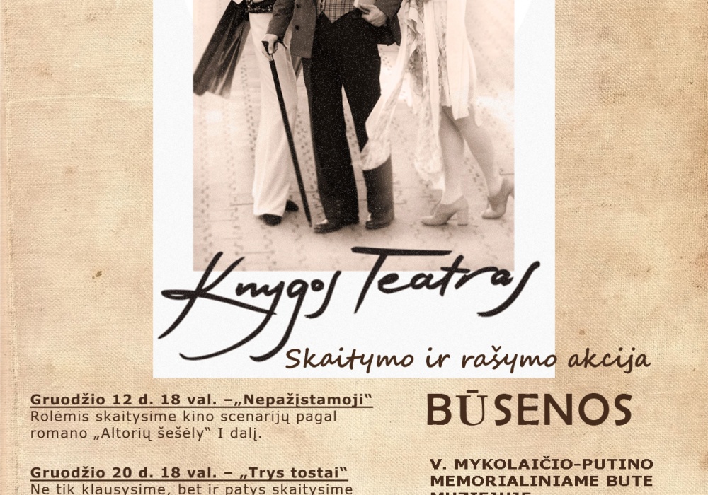 Keturis kartus skaitymo ir rašymo akcija „Būsenos” iš virtualios erdvės persikels į realią rašytojo svetainę jo memorialiniame bute-muziejuje Vilniuje, Tauro g. 10-3. Per pirmąjį susitikimą gruodžio 12 dieną susirinkusieji rolėmis skaitys kino scenarijų „Nepažįstamoji”, pagal V. Mykolaičio- Putino romano „Altorių šešėly” pirmąją dalį. Gruodžio 20 dieną muziejus lauks svečių, pasiruošusių ne tik paklausyti, bet ir paskaityti mėgstamiausių V. Mykolaičio-Putino eilių. Sausio 6-ąją, rašytojo gimimo dieną, bute-muziejuje „Knygos teatras” vaidins spektaklį „Altorių šešėly”. Na o sausio 11-osios vakaras bus skirtas prisiminimams apie rašytoją, jo laikmetį, jį supusius žmones. Muziejaus darbuotojai žada parodyti dokumentinių filmų apie V. Mykolaitį-Putiną, ištraukti fonduose saugomas fotografijas, paslėptą auksinį parkerį, bebro kailio kepurę ir dar daug visokiausių lobių! Gruodžio 12, 20 ir sausio 11 dienomis susitikimai prasidės 18 valandą, sausio 6 dieną – 14 valandą. Buto-muziejaus erdvės nėra didelės, todėl norinčių dalyvauti prašome iš anksto registruotis adresu [email protected] arba telefonu (8-5) 2624480. Renginiai nemokami.