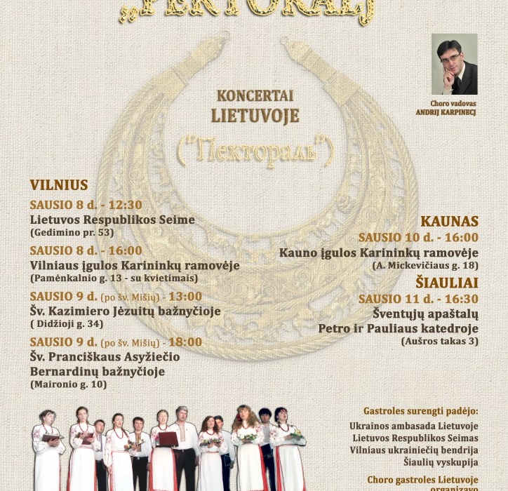 Profesionalus Kijevo mokytojų namų kamerinis choras „Pektoralj“ iš Ukrainos atvyksta koncertuoti į Lietuvą. Programoje numatyti koncertai Vilniuje, Kaune ir Šiauliuose. Koncertų metu skambės ukrainiečių liaudies dainos, kalėdinės bei bažnytinės giesmės. Choro koncertai nemokami.