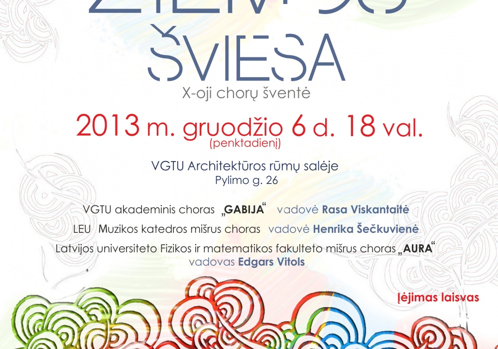 Jubiliejinė Vilniaus Gedimino technikos universiteto choro “Gabija” organizuojama chorų šventė “Žiemos šviesa”, kaip ir kiekvienais metais, kviečia visus muzikos mylėtojus ir ne tik pasimėgauti nuostabiais chorų pasirodymais.