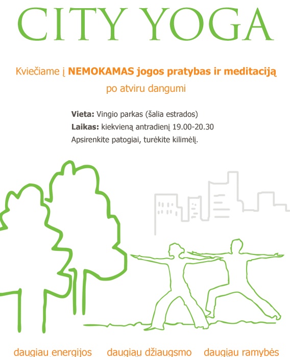 Kiekvieną antradienį šurmuliuojančio miesto širdyje, po atviru vasarėjančiu dangumi stabtelsime ramybės akimirkai, atsipalaiduoti ir surasti tikrojo džiaugsmo šaltinį. Joga – tai raktas į energiją, puikią savijautą, fizinę ir protinę sveikatą. Kviečiame į nemokamas jogos pratybas, nesvarbu kokio amžiaus, įsitikinimų ar sveikatos bebūtum!!