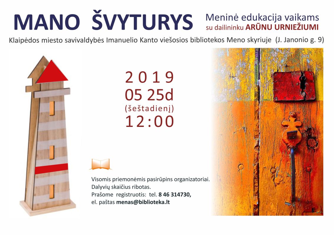 Gegužės 25 d. 12.00 val. Klaipėdos miesto savivaldybės Imanuelio Kanto viešosios bibliotekos Meno skyrius (J. Janonio g. 9) – dailės edukacija vaikams su menininku Arūnu Urniežiumi „Mano švyturys“.