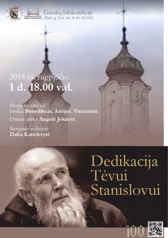 Rugpjūčio 1 d. 18.00 val. Klaipėdos miesto savivaldybės viešosios bibliotekos Girulių padalinyje (Šlaito g. 10A) kartu su renginio režisiere Dalia Kancleryte pakviesime prisiminti vieną iškiliausių XX a. antrosios pusės Lietuvos asmenybių, mažutėlių tarną – Tėvą Stanislovą. Renginio svečiai – broliai Benediktas, Astijus, Vincentas. Dainas atliks Angelė Joknytė.
