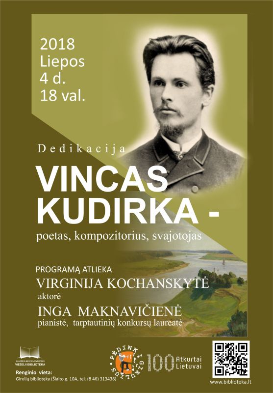 Liepos 4 d. 18.00 val. Klaipėdos miesto savivaldybės viešosios bibliotekos Girulių padalinyje (Šlaito g. 10A) miesto gyventojai ir svečiai turės progos pamatyti ir išgirsti Aktorės Virginijos Kochanskytės ir pianistės, tarptautinių konkursų laureatės Ingos Maknavičienės dedikaciją „Vincas Kudirka – poetas, kompozitorius, svajotojas“. Maloniai kviečiame.
