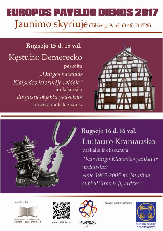 Rugsėjo 15–16 d. Jaunimo skyrius (Tilžės g. 9), prisidėdamas prie Europos paveldo dienų renginių Klaipėdoje, pristato naują projektą jaunimui „DINGĘS PAVELDAS“ (iš dalies finansuoja Kultūros paveldo departamentas). „Grąžinti miestui ir kraštui atmintį, kad nebūtume mankurtai, žinotume savo vertę ir didybę – svarbiausias mūsų uždavinys“, – yra sakęs istorikas, leidyklos „Libra Memelensis“ vadovas Kęstutis Demereckas. Jis ir pradės šį projektą rugsėjo 15 d. 15 val. paskaita „Dingęs paveldas Klaipėdos istorinėje raidoje“ ir iš karto po paskaitos pakvies į ekskursiją „Dingusių objektų pėdsakais“. Rugsėjo 16 d. 16 val. dalyvių laukia baras „Pupelė“, klubai „Prieplauka“, „Pas Albertą“, „mėnuliukai“, „skinkiemis“ ir dar keletas primirštų, bet kadaise buvusių labai svarbių jaunimui vietų, į kurias nuves sociologo Liutauro Kraniausko paskaita ir ekskursija „Kur dingo Klaipėdos pankai ir metalistai?“, skirta supažindinti ir prisiminti 1985–2005 m. jaunimo subkultūras ir jų erdves.