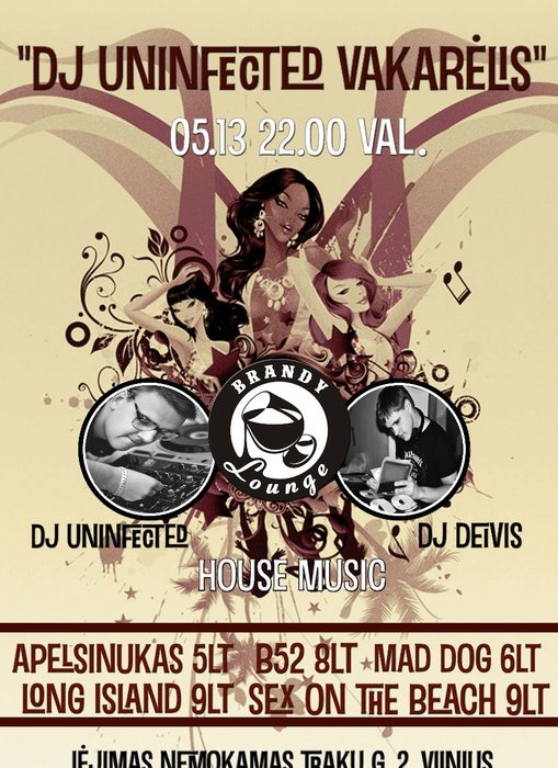 Vieta: Kavinė – baras Brandy Lounge, Trakų g. 2, Vilnius Laikas: Gegužės 13d. 22:00 – Gegužės 14d. 05:00 Įėjimas nemokamas Pavasaris pačiame įkarštyje ir siela reikalauja linksmybių ir šviežių įspūdžių. Kur jų rasti? Atsakymas paprastas. Penktadienio vakarėlyje Dj Uninfected b-day Party bare Brandy Lounge. Spalvoti kokteiliai, pavasariški house muzikos rimtai, naujos pažintys padovanos Jums naujus įspūdžius. Būk pasiruošęs tai atlaikyti! Jei jauti pavasarinį jėgų stygių, pasistiprink. Juk: – Apelsinukas 5Lt; – B52 8Lt; – Mad Dog 6Lt; – Long Island 9Lt; – Sex on the Beach 9Lt Būk ten, kur siautulys įsuks ir Tave! Būk Brandy Lounge bare!