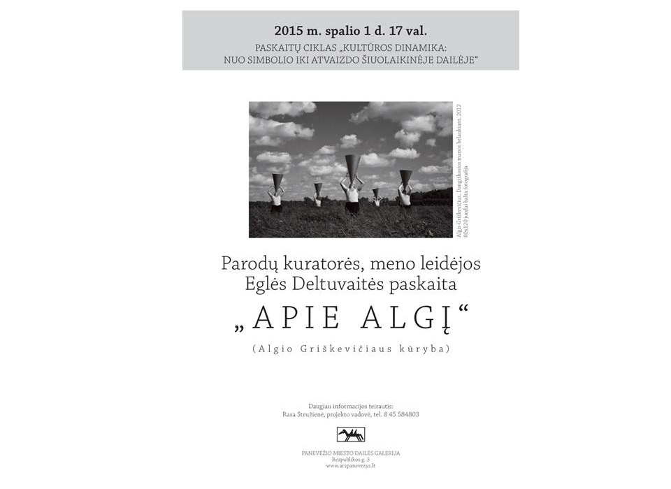 Paskaita „Apie Algį” – tai galimybė artimiau susipažinti su Algio Griškevičiaus kūryba ir pažvelgti į jos užkulisius. Sąmoningai pasirinktas toks paskaitos pavadinimas nurodo jos neformalų pobūdį, norą papasakoti apie menininką iš skirtingų perspektyvų. Tarp E. Deltuvaitės įžvalgų, pasvarstymų ir prisiminimų dokumentiniuose filmuose bus galima stebėti fotografijos ciklų atsiradimą, išgirsti autoriaus mintis apie kūrimo procesą ir kūrybinį kelią.