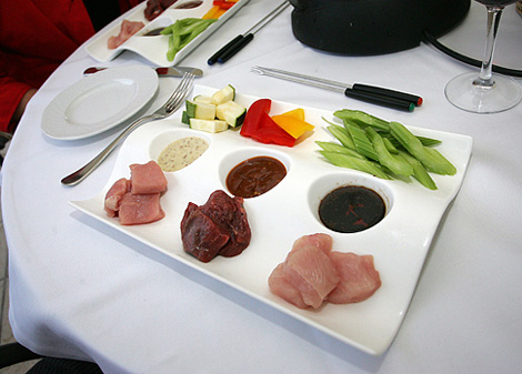 Kiekvienas žmogus turi savo ilgą šakutę, kurios galas yra pažymėtas skirtinga spalva. Pasmeigęs mėsos, žuvies ar daržovės gabaliuką, merkia jį į katilą ir laiko ten tol, kol apskrunda. Ištraukęs gabaliuką, jį nuima su paprasta šakute. Procesas ilgas, nes kaitinti galima tik vieną gabaliuką. Taip randi laiko smagiai pabendrauti su kompanija.