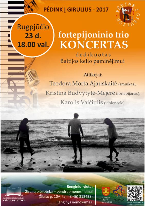 Rugpjūčio 23 d. 18.00 val. Girulių filiale-bendruomenės namuose (Šlaito g. 10A) kviečiami klaipėdiečiai, giruliškiai ir miesto svečiai pasiklausyti nuotaikingo fortepijoninio trio koncerto, dedikuoto Baltijos kelio paminėjimui.