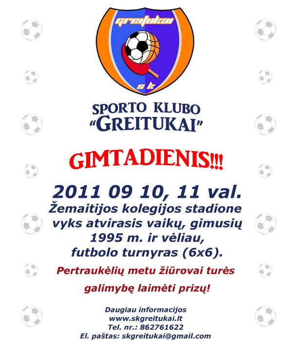 Rugsėjo 10 d. sporto klubas “Greitukai” švęs vienerių metų sukaktį. Ta proga klubas organizuos futbolo turnyrą (6×6) gimusiems 1995 m. ir jaunesniems vaikams. Turnyras vyks Rietave, Žemaitijos kolegijos stadione. Komandos galės registruoti po 8 žaidėjus. Registracija varžyboms internetu arba vietoje nuo 10:30 val.. Turnyro metu įvairiose varžytuvėse galės dalyvauti ir žiūrovai, kurie turės galimybę laimėti prizų. Sportininkų amžius bus tikrinamas, todėl privaloma pasiimti dokumentą įrodantį tapatybę.