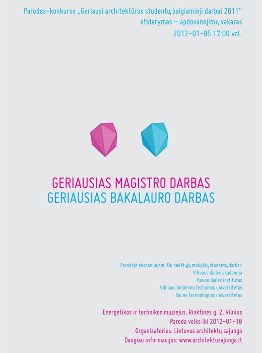 Sausio 5 d. 17:00 val. Energetikos ir technikos muziejuje (Rinktinės g.2, Vilnius) vyks Geriausių architektūros studentų baigiamųjų darbų 2011 parodos atidarymas, bus apdovanoti geriausio bakalauro ir magistro darbų autoriai.