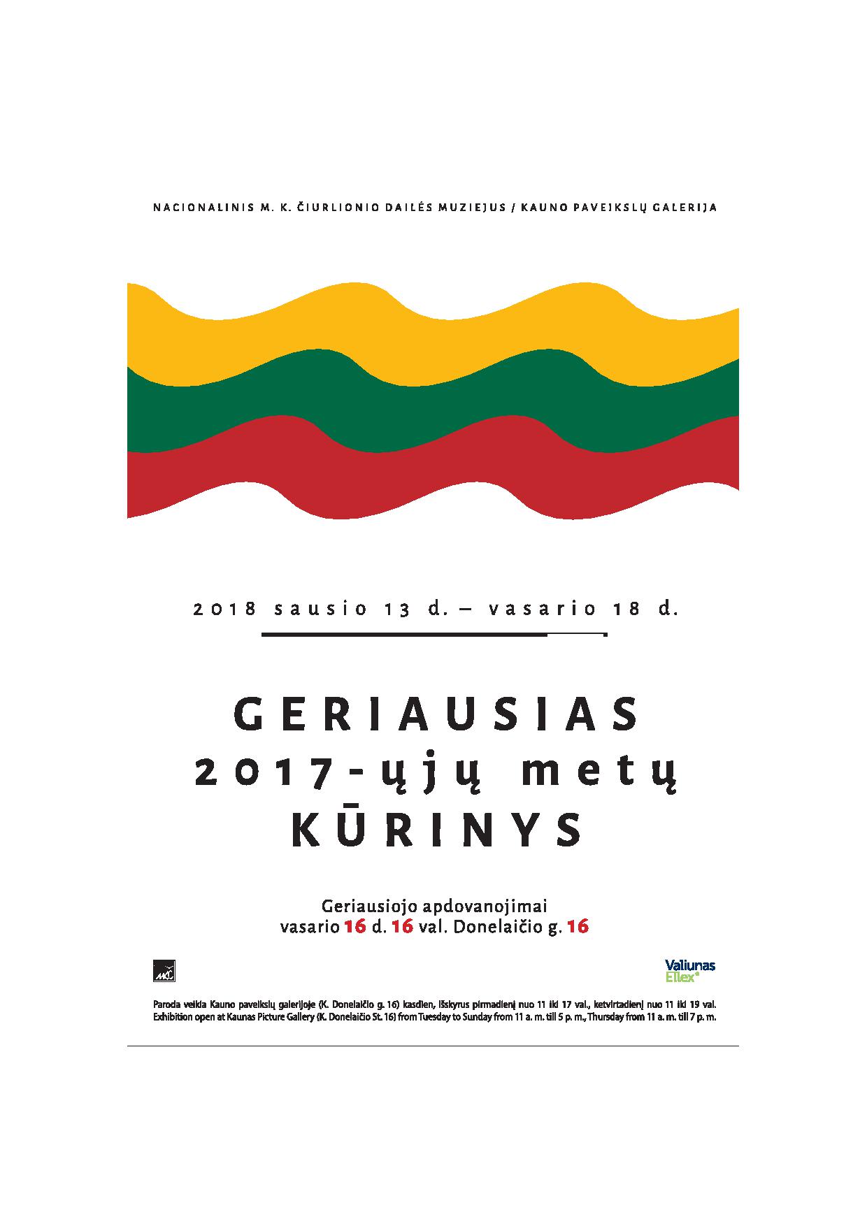 Parodoje „Geriausias 2017 metų kūrinys“ eksponuojami 105 darbai. Kaip ir kasmet čia gausu įvairiausių temų bei stilistikos kūrinių. Kadangi ši paroda neturi koncepcijos ir menininkams nereikia taikytis prie duotos temos, tad jie turi galimybę į parodą atnešti tai, kuo gyvena, kaip jų išgyvenimai persikūnija į meno kūrinius.