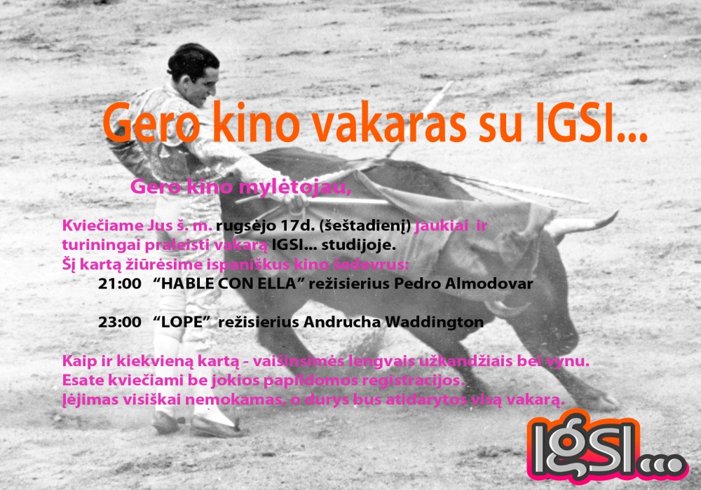Atėjo šaltas ruduo, o kartu su juo atslinko lietus, niūrus šaltis. Tokiais orais, atrodo, net nežinai, kur nueiti, ką pamatyti. Tiesa? Mes turime Jums idėją: ateikite pas mus, į studiją IGSI…, įsikūrusią pačioje Užupio širdyje. Kartu smagiai šeštadienio vakarą žiūrėsime filmus, jaukiai gersime vyną, drauge pažindinsimės bei aptarinėsi matytus filmus ir ne tik… Susimatom? 🙂
