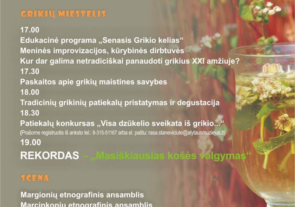 Alytaus kraštotyros muziejus rugsėjo 6 d. rengia “Grikių šventę”, kurioje visi norintys galės prisiminti ar naujai susipažinti su pačiomis netikėčiausiomis grikių panaudojimo galimybėmis.