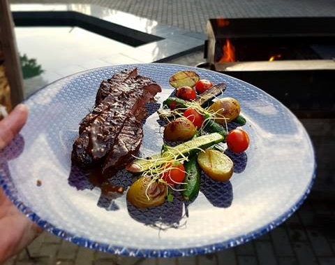 Trijų patiekalų degustacinės lauko grilio vakarienės meniu: