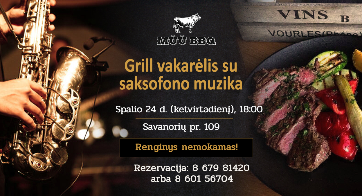 Ketvirtadienio vakarą MŪŪ BBQ šefas Eltonas ruošia tikrą šventę grill mėgėjams! Vakaras subalansuotas ir švenčiantiems gimtadienius, ir po darbo susirinkusiems kolegoms, ir porų pasimatymams. Šventišką atmosferą palaikys saksofonisto Artūro Puodžiukaičio gyvos muzikos koncertas žvakių šviesoje. Koncertas su pertraukomis nusimato iki 21 valandos. Ketvirtadieniais restorane MŪŪ BBQ – 20% nuolaida šonkauliukams.