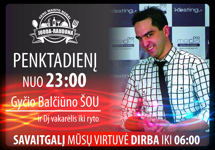 Baras JUODA RAUDONA kviečia penktadienį sutikti įsimintinai ir sudalyvauti Gyčio Balčiūno šou. Čia jūsų laukia linksmosios užduotys, prizai ir siurprizai, gera nuotaika bei šokiai iki ryto!