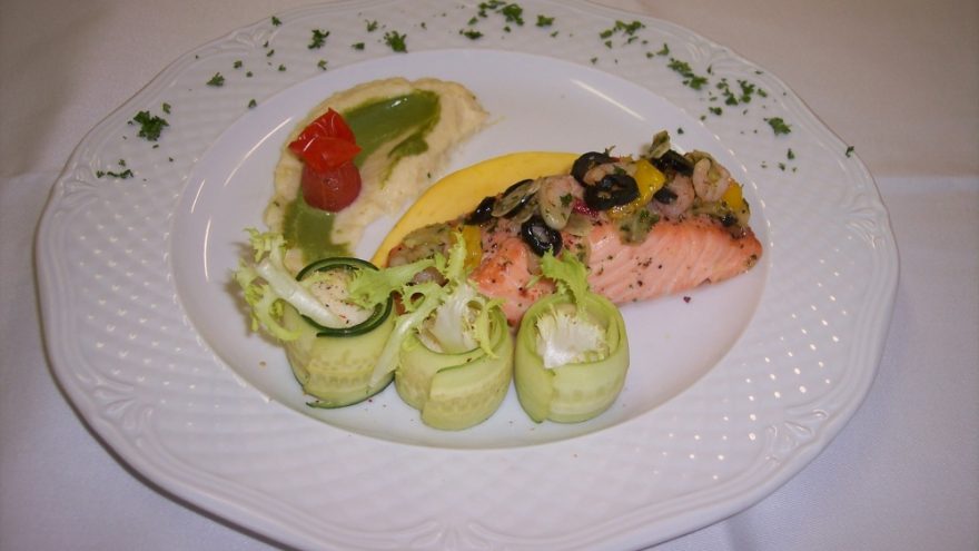 Lašišų filė, kepta orkaitėje su aromatingu žolelių, migdolų ir krevečių užtepu – 30.00* Lt