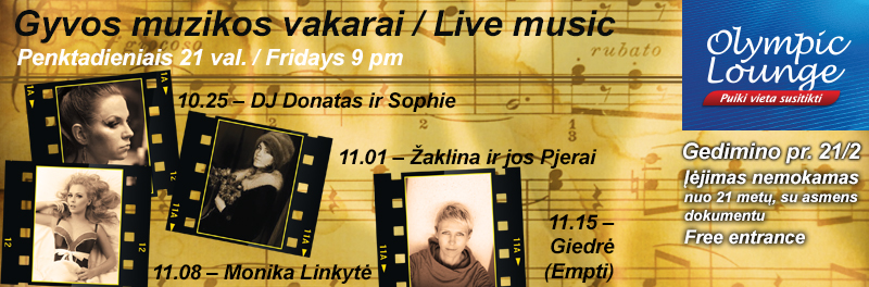 Keturis penktadienius iš eilės Gyvos muzikos vakarai, 21 val., atsinaujinusiame Olympic Lounge bare, Gedimino pr. 21/2.