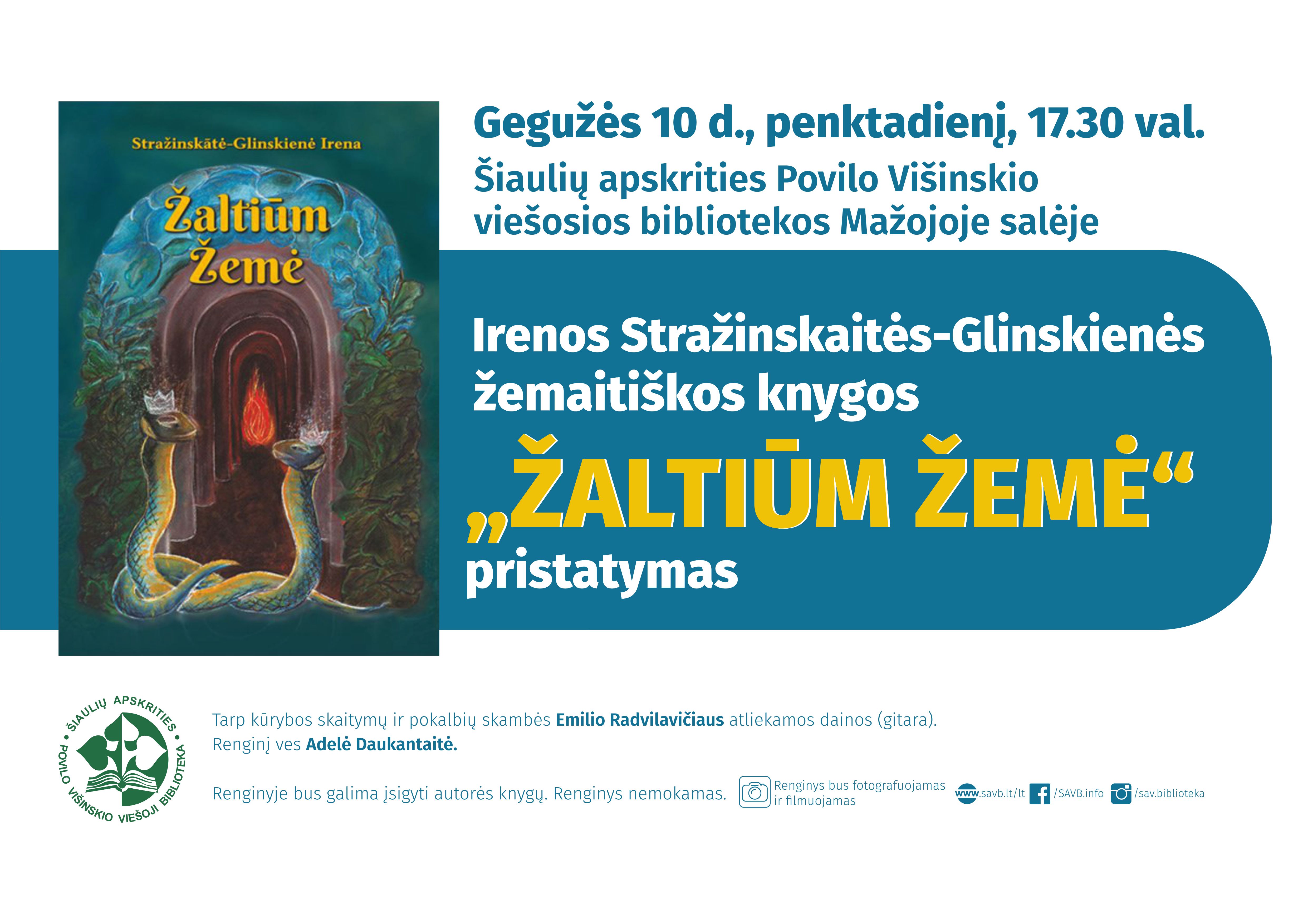 Gegužės 10 d., penktadienį, 17.30 val. Šiaulių apskrities Povilo Višinskio viešosios bibliotekos Mažojoje salėje Irena Stražinskaitė-Glinskienė šiauliečiams pristatys savo knygą „Žaltiūm žemė“.