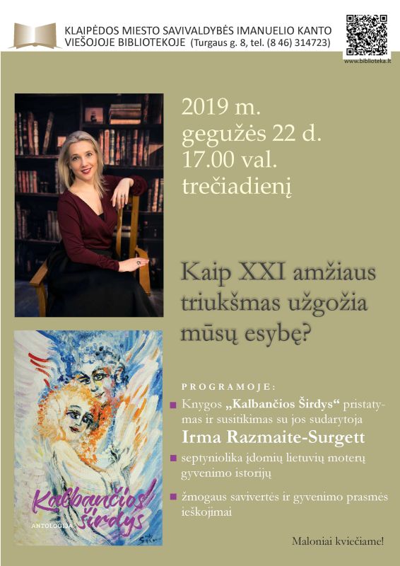 Gegužės 22 d. 17.00 val. Klaipėdos miesto savivaldybės Imanuelio Kanto viešojoje bibliotekoje (Turgaus g. 8) vyks Irmos Razmaitės-Surgett knygos „Kalbančios Širdys“ pristatymas ir susitikimas su leidinio sudarytoja bei Londone ir Lietuvoje gyvenančiomis autorėmis, kurių istorijos pateikiamos knygoje. Renginio tema – „Kaip XXI amžiaus triukšmas užgožia mūsų esybę?“.