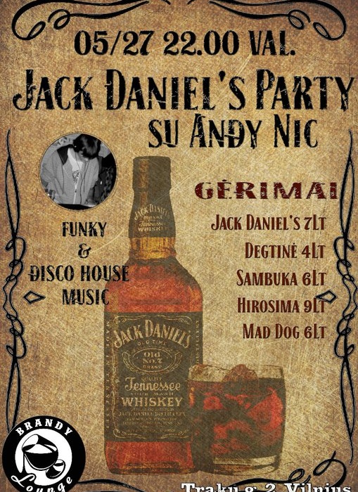 Vieta: Kavinė – baras Brandy Lounge, Trakų g. 2, Vilnius Laikas: Gegužės 27d. 22:00 – Gegužės 28d. 05:00 Įėjimas nemokamas Artėjant vasarai, Brandy Lounge vakarėliai tampa vis karštesni bei ryškesni. Atsipūsti ir linksmintis visu pajėgumu gali visi, kas pasirenka šį barą. Paparacių blyksniai ir viskis Jack Daniel’s su kola, užvedantis Dj Andy Nic už pulto – kas gali būti geriau? Uždekime žalią šviesą nakties nuotykiams. Šį penktadienį linksminkimės pagal funky ir disco house ritmus. Vakaro gėrimas – Jack Daniel’s su kola – pridės nuotaikos ir drąsos akimirksniu. Jei viskis nevilioja, rinkis gėrimus iš plataus mūsų meniu ir nepamiršk, kad: – Jack Daniel’s 7Lt; – Degtinė 4Lt; – Sambuka 6Lt; – Hirosima 9Lt; – Mad Dog 6Lt Laukiame Jūsų Tapk mūsų draugu: www.facebook.com