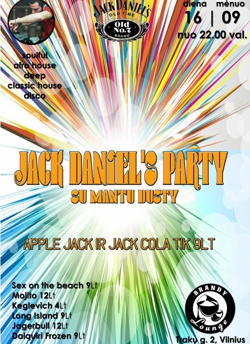 Tikri viskio mėgėjai nekantriai laukia ypatingo ankstyvo rudens įvykio – legendinio viskio Jack Daniel gimtadienio. Pagaliau šis gimtadienis atvyko ir į Brandy Lounge barą. Tad šį penktadienį viskis Jack Danie’sl laukia Jūsų Brandy Lounge bare. Bet koks gimtadienis be bendravimo, muzikos ir staigmenų? Pasiruoškite užvedantiems muzikos garsams, kuriais pasirūpins Mantas Dusty (soulful, afro house, deep, classic house, disco). O kur dar šaunieji barmenai, kurių padaryti kokteiliai Jums tikrai neleis atsikvėpti. Specialiai šiam gimtadieniui alkoholiniai kokteiliai Apple Jack arba Jack Cola Jums bus pasiūlyti patrauklia kaina. Visą penktadienį šie kokteiliai kainuos tik 9 litus. – Apple Jack or Jack Cola 9Lt; – Sex on the beach 9Lt; – Mojito 12Lt; – Keglevich 4Lt; – Long Island 9Lt; – Jagerbull 12Lt; – Daiquiri Frozen 9Lt Ateikite ir patys viską sužinosite!