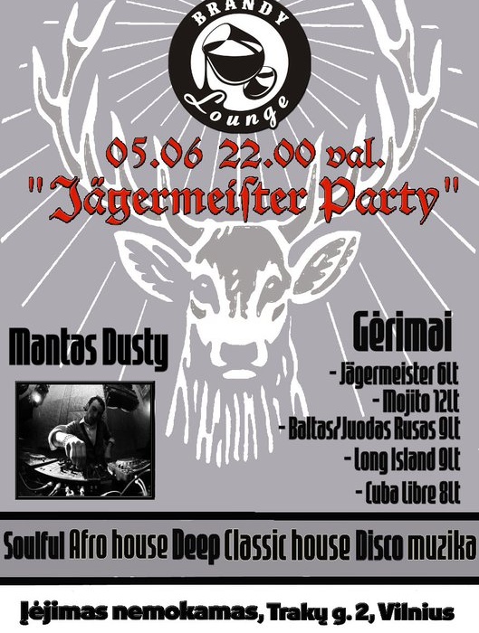 Vieta: Kavinė – baras Brandy Lounge, Trakų g. 2, Vilnius Laikas: Gegužės 6d. 22:00 – Gegužės 7d. 05:00 Įėjimas nemokamas Kaip Jūs kovojate su stresu po įtemtos darbo ar mokslų savaitės? Valgote sausainius prie TV ar užsiiminėjate joga? Brendžio Baras siūlo savo receptą, patikrintą laiko. Tai šokiai, linksmybės, bendravimas, puiki kompanija ir keletas puikiai nuteikiančių kokteilių. Tad šį penktadienį, Brandy Lounge baras kviečia atvykti į anti-stresinį vakarėlį, pasikrauti teigiamų emocijų! Teigiamai nuteiks ne tik Mantas Dusty su: – soulful; – afro house; – deep; – classic house; – disco muzikos ritmais Tačiau nepamirškite ir tai, kad tik šį penktadienį likeris Jägermeister kainuos tik 6 litus. Mėgstantiems gaivesnius kokteilius, galime pasiūlyti: – Mojito 12Lt; – Baltas/Juodas Rusas 9Lt; – Long Island 9Lt; – Cuba Libre 8Lt ir tai dar ne viskas. Daugiau rasi atvykęs į Brandy Lounge barą! Ir tegul Jūsų nepalieka pavasarinė nuotaika