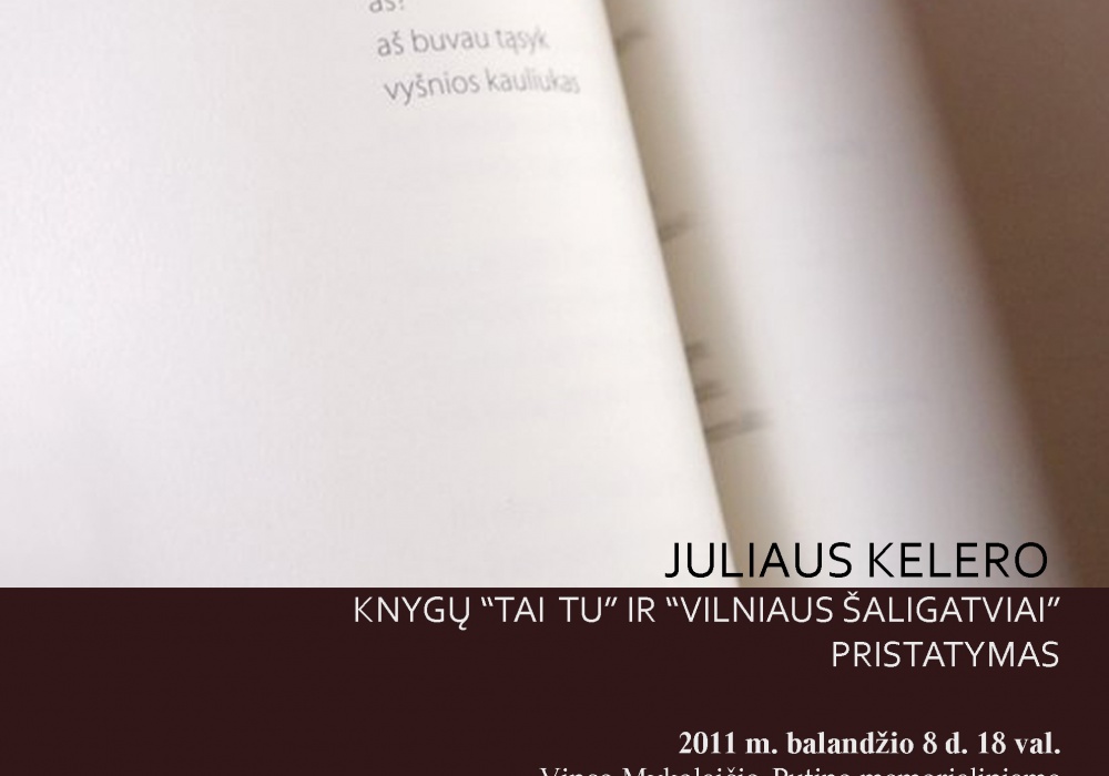 Balandžio 8 d., penktadienį, 18 val. Vilniaus memorialinių muziejų direkcijos V. Mykolaičio-Putino memorialiniame bute-muziejuje (Tauro g. 10-3) – Juliaus Kelero poezijos knygos “Tai Tu” ir fotografijos albumo “Vilniaus šaligatviai” pristatymas. Renginyje dalyvaus knygų autorius, aktorė Jolanta Dapkūnaitė, filosofas Nerijus Milerius, menotyrininkė Agnė Narušytė ir literatūros kritikė Jurga Tumasonytė.