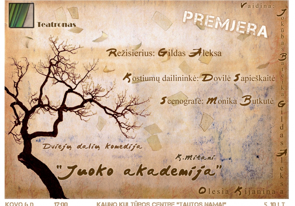 Kovo 6 d., 17.00 val. Kauno kultūros centre “Tautos namai” (Vytauto pr. 79/ Kęstučio g.1) asociacijos „Teatronas” premjera – dviejų dalių komedija „Juoko akademija”, pagal Koki Mitani pjesę, režisierius – Gildas Aleksa.