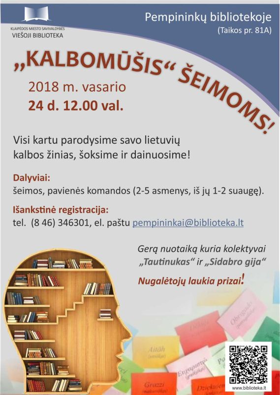 Klaipėdos miesto savivaldybės viešosios bibliotekos Pempininkų padalinyje (Taikos pr. 81A) organizuojamas „Kalbomūšis“ šeimoms.