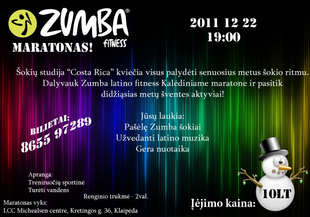 Gruodžio 22d. 19:00val. Šokių studija “Costa Rica” kviečia visus palydėti senuosius metus šokio ritmu. Dalyvauk Zumba latino fitness Kalėdiniame maratone ir pasitik didžiąsias metų šventes aktyviai! Jūsų laukia: Pašėlę Zumba šokiai Šokių pamokos Užvedanti latino muzika Gera nuotaika Įėjimo kaina 10Lt Bilietus įsigyti galite paskambinę telefonu 865597289 Apranga: Sportinė treniruočių, turėti vandens. Renginys vyks: LCC Michealsen centre, Kretingos g. 39, Klaipėda Dėmesio! Vietų skaičius ribotas. Parduodami tik 100 bilietų!