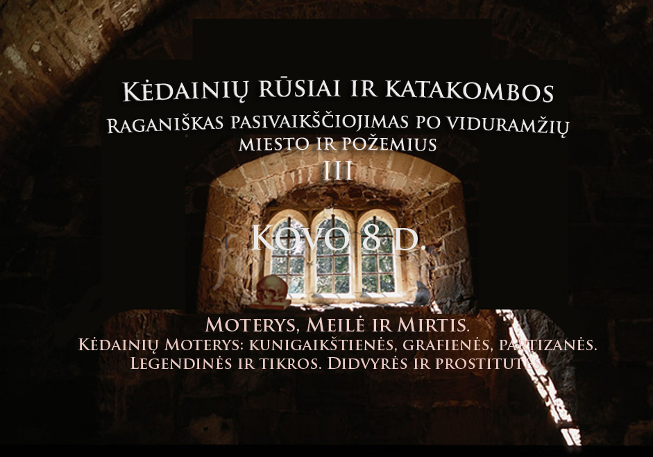 Užgavėnės – susitikimo su mirusiųjų vėlėmis laikas. Šiemet jis beveik susidurs su švente, kurią sukūrė moterys, amžininkų vadintos neramiomis sielomis. Revoliucijos raganų pagimdyta kovo 8-oji tapo ramia moterų švente. Tačiau Moterys, Meilė ir Mirtis istorijoje visada žygiavo drauge. Trečiasis pasivaikščiojimas po miesto rūsius ir bus skiriamas Kėdainių moterims. Paženklintoms įvairiausių likimų. Didvyrėms ir kankinėms. Paprastoms miestietėms ir rūmų grafienėms. Aplankysime požemius, kuriose jos buvo kalintos. Kriptas, kuriose jos su karališkomis iškilmėmis buvo palaidotos. Purvynus, kur jos buvo numestos po mirties. Nusileisime į senuosius mūsų miesto rūsius, kuriuose šimtmečius tekėjo įprasta miesčioniška kasdienybė: škotų pirkliai laikė burgundišką vyną, žydų kromelninkai ritino silkių statines, lietuvių šeimininkės sūdė agurkus.
