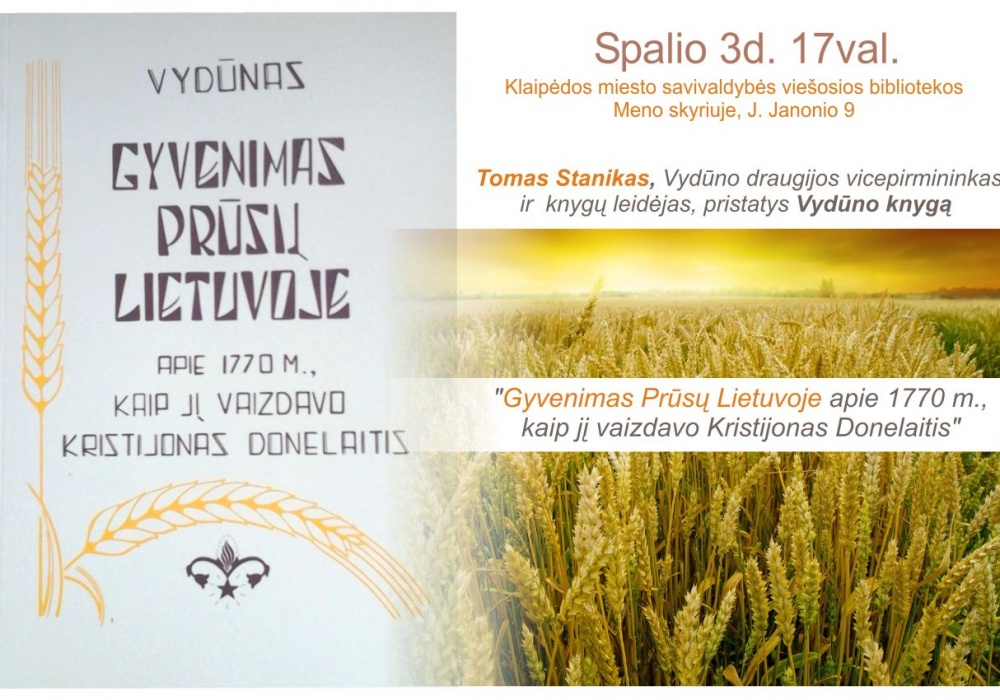 Spalio 3 d. 17 val. Klaipėdos miesto savivaldybės viešosios bibliotekosMeno skyriuje (J. Janonio g. 9) Tomas Stanikas, Vydūno draugijos vicepirmininkas ir knygų leidėjas, pristatys Vydūno knygą „Gyvenimas Prūsų Lietuvoje apie 1770 m., kaip jį vaizdavo Kristijonas Donelaitis”.