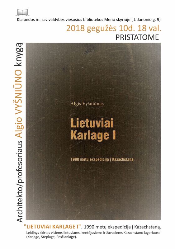 Klaipėdos miesto savivaldybės viešosios bibliotekos Meno skyriuje (J. Janonio g. 9) kviečiame į architekto/profesoriaus Algio Vyšniūno knygos „Lietuviai Karlage I“ pristatymą.